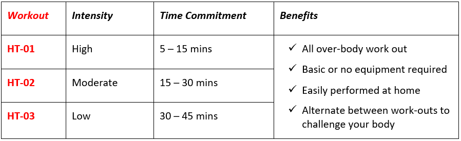 These can all be carried out freely from your home depending on your level of fitness and endurance. Each one incorporates similar exercises and can be performed in under an hour. How much time you’re able and willing to commit will determine the level of intensity you’d need to stick with throughout your work-out to achieve optimal results.